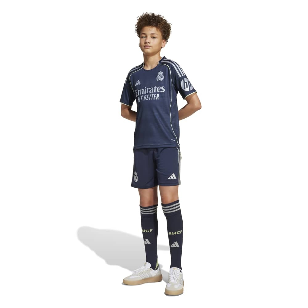 No importa si has visitado el mágico Bernabéu o no, demuestra tu pasión madridista con este conjunto adidas para adolescentes inspirado en el estadio. Se trata de una versión para peques del conjunto segunda equipación que visten los jugadores, e incorpora un estampado efecto muaré y detalles metalizados plateados, que imitan la reluciente fachada del estadio. No importa si estás en las gradas vitoreando a tus héroes o si están en el campo imitándolos, la tecnología AEROREADY mantiene la piel seca.